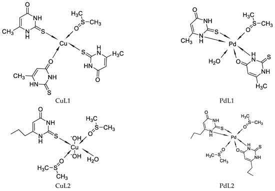 The representation of coordination binding sites for 6-metyl-2-thiouracil and 6-propyl-2-thiouracil with copper and palladium ions is shown in Figure 5.