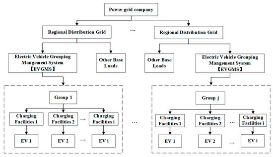 As shown in Figure 1, the electric vehicle cluster control architecture is mainly composed of the grid corporation, the regional distribution network, the EVGMS (Electric Vehicle Grouping Management System), and the electric vehicles; this architecture is used to manage and coordinate the calculation and communication system of electric vehicle clusters. As the number of in-grid electric vehicles is continuously expanding, the massive storage and calculation of statistics make it vulnerable to a “dimensional disaster” if the regional power distribution network gathers and dispatches the demand for each electric vehicle directly. However, due to the large group of EVs in the regional distribution network, the intraday charging demand and load distribution show regularity; so, a day-ahead–intraday multi-timescale clustering strategy is established to intelligently schedule and synchronize the charging and discharging activities of electric vehicles using the EV cluster management system, which reduces the algorithmic dimensions and accelerates the computation speed while taking into account the user’s satisfaction.
