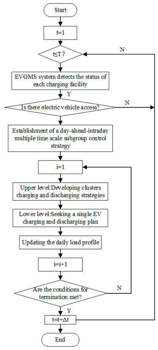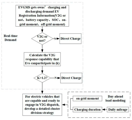 As shown in Figure 3, in view of the stochastic nature of electric vehicle grid access, electric vehicles are divided into two categories: those that participate in V2G dispatching and those that do not, based on the real-time intraday collection of vehicle owner demand. The EVGMS system then calculates whether the electric vehicle is V2G-responsive or not. Electric vehicles that fail to have V2G responsiveness are charged directly. Finally, for EVs with the capability and willingness to participate in V2G dispatching, a clustering strategy is developed according to the day-ahead load model.