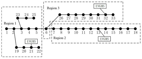 In this paper, as an example, the IEEE33 node distribution network (shown in Figure 4) is divided into three regions to simulate the proposed electric vehicle cluster orderly charging and discharging scheduling model and the cluster allocation method. In the simulation, we select a reference power of 10 MVA, a reference voltage of 12.66 kV, and an allowable voltage offset of ±5% at the load node [26].