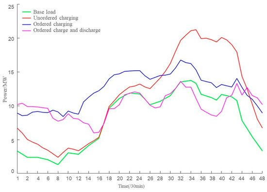 To compare the real-time cluster dispatching strategy with the disorderly charging model, the load curve in this paper is shown in Figure 5. In particular, disorderly charging refers to the practice where an electric vehicle, upon connection to the grid, charges directly at maximum power until it reaches a need.