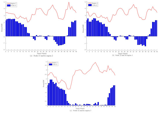 Figure 6 illustrates the power response curves of three different nodes which are randomly accessed by electric vehicles during the dispatch time interval, as well as the load curves of the region where the nodes are located. As the figure shows, by adopting the charging and discharging strategy in this paper, each of the access nodes for electric vehicles can perform according to a charging and discharging schedule, while calming the regional load curve fluctuations.