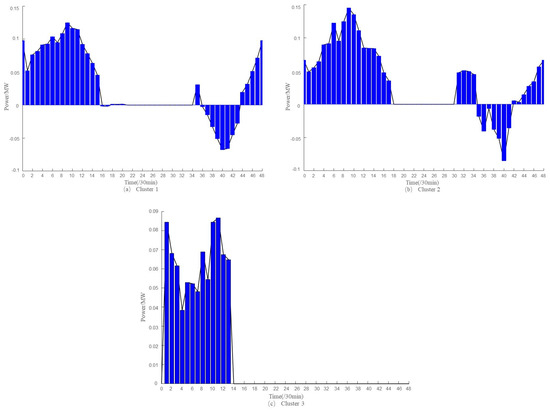 Figure 7 randomly selects three clusters whose scheduling times are 17:00–10:00, 15:00–8:30, and 24:00–6:30, respectively. As can be seen, the scheduling commands issued by EVGMS and the real-time response of each cluster are basically matched. Of these, the clusters with dispatch hours of 24:00–6:30 take full advantage of the low valley tariffs to recharge, whereas the clusters whose dispatch times are 17:00–10:00 and 15:00–8:30 discharge at peak load times, which not only feeds power back into the grid but also provides revenue for the vehicle owner.