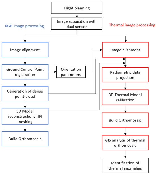 This study proposes a methodology resulting from the combination of different strategies based on the simultaneous capture of RGB and TIR images with low-cost dual sensors. Based on previous works, the proposal is based on solving the problems in the alignment of the thermal images of the structure from motion (SfM) algorithms used in modern photogrammetry [64] by implementing the optimized external orientation parameters (X, Y, Z coordinates and pitch, yaw, and roll angles) of the RGB images to position the TIR images [46].