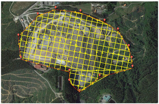 The automatic flight for image acquisition was designed using the proprietary software of the UAV to guarantee maximum compatibility. The sensor was configured with an inclination of 30° with respect to nadir to adequately capture the steep slopes of the landfill. The automatic flight designed and its main specifications are shown in Figure 4 and Table 4.