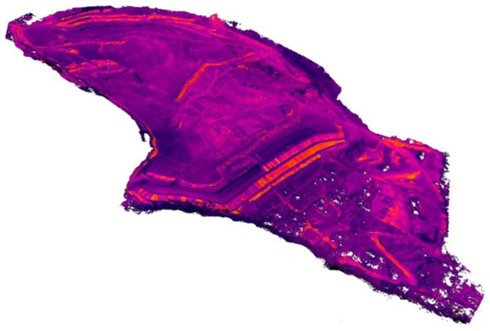 From the previous 3D RGB model, the 3D thermal model was generated following the workflow shown in Figure 1. The orientation parameters of the RGB images were exported to align the thermal images. Subsequently, the thermal information from the oriented TIR images was projected onto the 3D RGB model, giving false color to each of the points of the representation, enabling acquisition of the thermal model (Figure 6) and the 13.8 cm/px GSD thermal orthoimage shown in Figure 7. The set of thermal images in R-JPEG format enabled acquisition of qualitative and quantitative data that represents the temperature gradient in false color.
