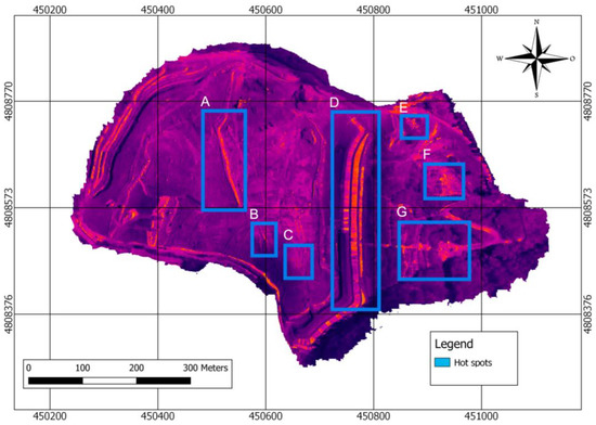 On the other hand, in the two hot spots on the right of the image (E and F), which are around the oldest landfill, at a lower elevation, the absence of LFG collection wells can be observed. This condition may imply the emission of biogas to the atmosphere and a consequent increase in temperature as the gas migrates through the deposited MSW layers. In the identified area related to a possible material stockpile, the temperature is 26.4 °C, which is higher than the 24.9 °C of the nearby road and the 18.2 °C of the surrounding vegetation. This anomaly may therefore be due to the decomposition of organic matter, ashes from energy recovery deposited in that area of the landfill, etc. Finally, the hot spot of the homogeneous zone without vegetation (G) shows temperatures of 23.8 °C compared to 19.7 °C in the surrounding cold zones. In this case, in the absence of any other reason for or interpretation of the RGB image, a possible LFG emission can be intuited due to the absence of collection wells in this location.