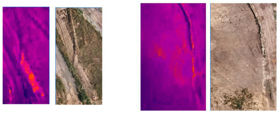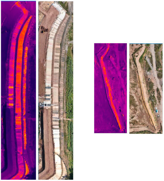 Photointerpretation of the analog RGB orthoimage provides the most extensive thermal anomalies identified, such as zones A and D, with temperatures of 41.6 °C and 31.2 °C, respectively. Most of the hot spots identified correspond to areas of the landfill where plastic liners and geotextiles are exposed, awaiting the deposition of new MSW to cover them, as can be seen in Figure 9.
