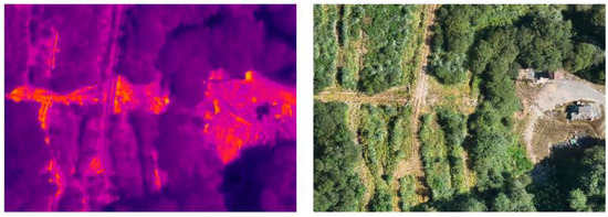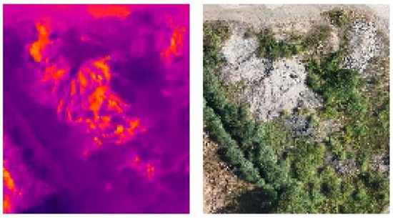 Images are the fundamental basis of photogrammetry for the generation of three-dimensional models or orthoimages [41]. In the field of UAVs, images are generally captured on the basis of preprogrammed automatic flights that are designed according to the needs of the project objective [42]. At present, despite the losses in sensitivity and accuracy associated with low-cost UAVs, they are the most widely used alternative in several investigations [43]. This study proposes the use of dual sensors integrating an infrared thermal sensor and a non-metric visual sensor, enabling the capture of RGB and TIR images simultaneously from the same point of view [44]. Working with this type of low-cost equipment requires careful work during the planning and execution of the activities in order to overcome their limitations and obtain accurate results [45].