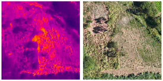 The photogrammetric flight for the capture of the RGB and TIR images was designed following the established recommendations for image capture with low-cost UAV equipment. The flight began at 9:00 a.m. with the image capture, after a previous wait of 30 min for the stabilization of the sensor. During the flight, the atmospheric conditions were favorable for data collection; the ambient temperature was 21 degrees and the skies were clear with no wind.