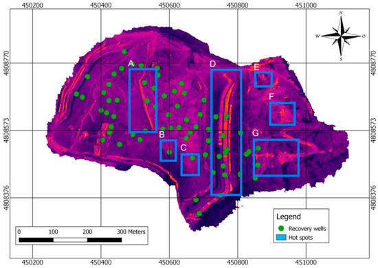 In addition, the areas of both hot spots are close to some of the 79 collection wells located along the entire length of the landfill, which are shown in green in Figure 14.