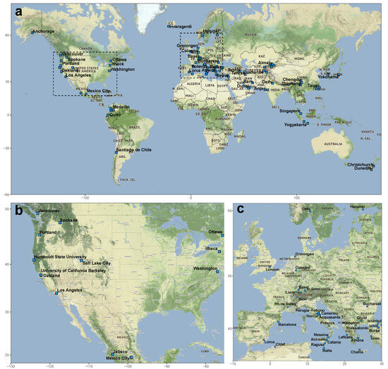 We collected information about 105 different USNs. The collection criteria were basically two: (i) the earthquake network should mainly cover an urbanized area (town, city, or metropolitan area) and (ii) it should have been active at least for some months. Moreover, measurements encompassing the systematic repositioning of sensors rather than their simultaneous recording as a proper network were excluded. We did not include deployments of sensors in different non-contiguous urban areas. Such situations do not describe independent and complete networks with characteristics that can be easily quantified (e.g., number of sensors or covered area). As an example, what are often referred as citizen–based or community-based networks usually show a patchy distribution over many different urban areas and even different countries [9,10,11].