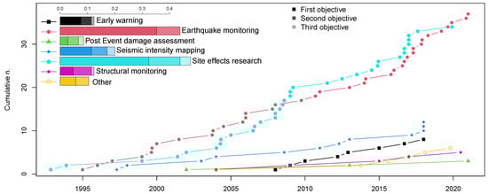 The worldwide distribution of USNs (Table 1) is shown in Figure 1a. The networks are not uniformly distributed around the world; North America and the Euro-Mediterranean region are the two zones where most of the USNs are located (Figure 1b,c). A total of 37 different countries are present in the catalogue. The USA, Italy, and Turkey are the most represented, with 13, 9, and 7 USNs, respectively. Several cities represented the target for more than one urban network over the time, mainly driven by their high seismic hazard. These include Istanbul (Turkey), Bursa (Turkey), Quito (Ecuador), Bishkek (Kyrgyzstan), Bucharest (Romania), Gyeongju (South Korea), Los Angeles (USA), and Bogotà (Colombia), to mention only some of them.