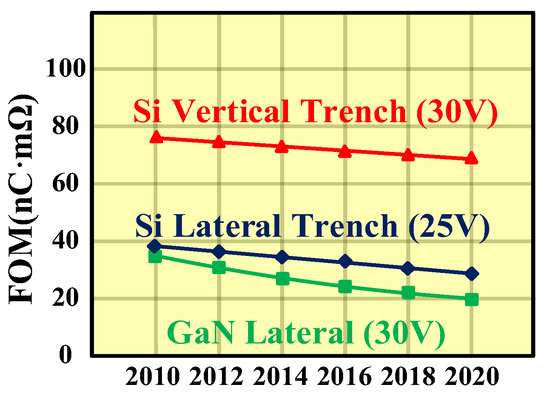 Among the major challenges, the power switch dominates conduction and switching losses. Conduction and switching losses are primarily determined by the on-resistance value (Ron) and total gate charge value (QG), respectively. Figure-of-merits (FOM = Ron × QG) of the Si vertical trench, Si lateral trench and GaN lateral trench are shown in Figure 2 [16,17,18]. Due to the wider bandgap, higher electron mobility and electron velocity of GaN HEMT, its FOM is several times lower than that of Si MOSFET. These material characteristics result in lower power losses in GaN HEMT in high-frequency applications. However, GaN HEMTs are usually discretely packaged due to unique fabrication processes, which are preferable in 3D-SPS [19,20,21]. For low-power and high-integrated applications, the Si lateral diffused MOSFET (LDMOSFET) is usually applied in PSiP and PwrSoC because of compatible fabrication processes [22].