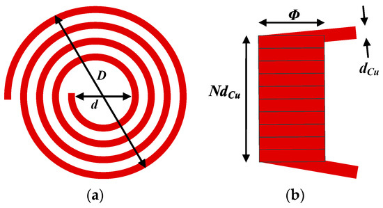 For a tightly winding solenoid inductor, the winding diameter, ϕ, coil turn, N, and coil section diameter, dCu, determine its profile and inductance value. When the winding structure is cylinder, the inductance value of the solenoid inductor is given by [40] the following: