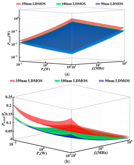 In Figure 11a, the optimized power loss of the integrated Si LDMOSFET is proportional to fs1/2 instead of fs, which shows the potential for high-frequency switches. As the switching frequency increases, the power loss of the integrated Si LDMOSFET increases at a rate of fs1/2. As the power level increases, the power loss of the integrated Si LDMOSFET increases at a rate of Po. In addition, the power losses of the integrated LDMOSFEET under more advanced processes are reduced due to reductions of the parasitic capacitors and resistors.