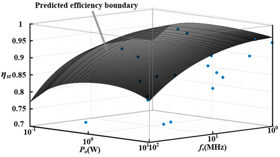 According to Figure 11b and Figure 12b, the efficiency boundaries of PSiPs are predicted and verified in Figure 13 [42,43,44,45,46,47,48,49,50,51,52,53,54,55,56,57,58,59,60,61]. In order to eliminate the effect of input and output voltages on efficiency, the efficiencies in the literature are normalized according to the following: