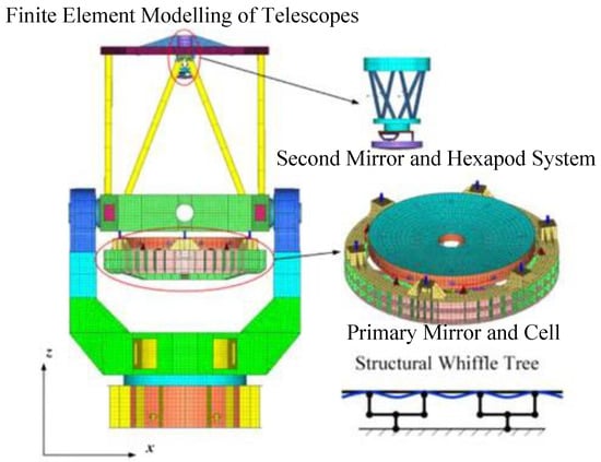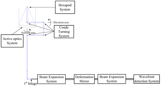 The diagram of the 4 m class ground-based telescope system described in this article is illustrated in Figure 1, the optical system of which is in the form of a Cassegrain. The dimensions of the system are 12.5 m × 5.8 m (height × diameter) and a total mass of approximately 90 tons. The optical structure of the telescope mainly includes a tracking frame, primary mirror, secondary mirror, Couder system, adaptive optical imaging system, and multiple imaging terminals. To simplify the analysis process, we only considered the first five parts.