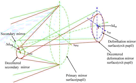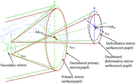 We consider the classic primary and secondary mirror system with a Cassegrain structure as an example. The misalignment error of the optical system is mainly due to the gravitational bending and sinking of the primary and secondary mirrors, as well as temperature-induced changes in their relative positions, resulting in a shift in the system’s optical axis. An unstable optical axis of the system can cause a change in the position of the focal point of the primary and secondary mirrors, causing a shift in the pupil surface of the primary mirror [21,22,23,24].