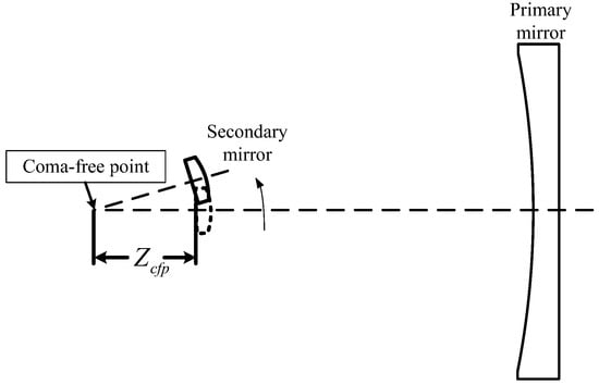For the coma, an additional term is added to Equation (19). For astigmatism, and are added to Equation (20). If the deviation is small, the on-axis field-of-view (FOV) image dispersion increment term will be negligible relative to the coma increment term. For the telescope system with a cassette structure, when the displacement occurred along the optical axis direction, the aberration was defocused and spherical, which can be corrected by moving the secondary mirror along the axial direction. When the vertical optical axis direction has shift and tilt, a constant coma is produced in the FOV, which can be corrected by translating or tilting the secondary mirror along the vertical optical axis. The telescope system error mainly comprises the relative position errors of the primary and secondary mirrors. For the on-axis FOV, if the aberration is corrected, the central axis of the primary and secondary mirrors will intersect at a coma-free point (Figure 9).
