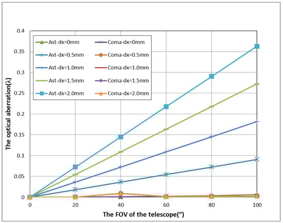The following conclusions can be drawn from the calculated results of the secondary mirror deviations shown in Figure 12 and Figure 13 and the optical-axis deviations of the main system in Figure 14 and Figure 15.