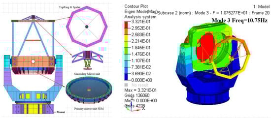 The finite element analysis model of the telescope. The model includes the telescope mechanics, primary mirror, primary mirror cell, secondary mirror, and hexapod system.