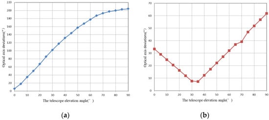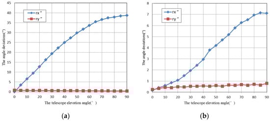 The angle deviations between primary and secondary mirror vs. the telescope elevation angle. The data results were obtained through the deformation analysis of the telescope. (a) Before compensation; (b) after compensation.