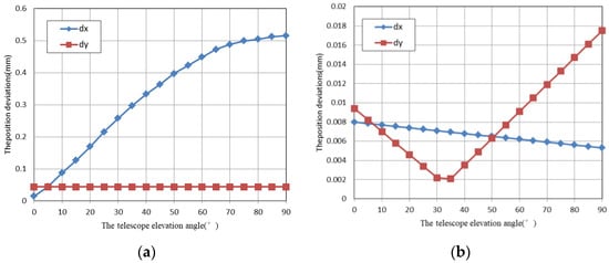 The position deviations between primary and secondary mirror vs. the telescope elevation angle. The data results were obtained through the deformation analysis of the telescope. (a) Before compensation; (b) after compensation.