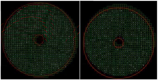 Subsequently, since the Hartmann detector is the conjugate surface of the primary mirror, the effectiveness of the compensation method was verified by the pupil shift of effective sub-aperture on the Hartmann detector during the actual calibration of the adaptive optical imaging system. The pupil shift of effective detection sub-apertures of the Hartmann detector before and after compensation is shown in Figure 16.