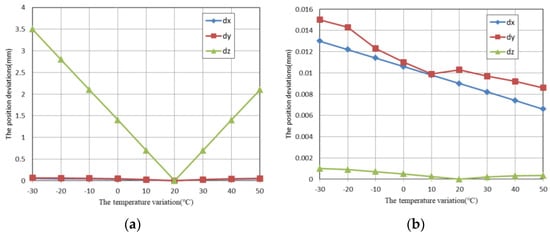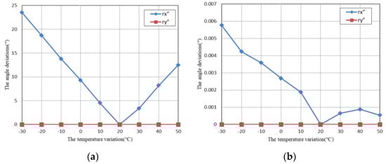 The thermal deformation analysis of the telescope system at different ambient temperatures (−20–50 °C) is illustrated in Figure 11. The variation in the angular deviation of the secondary mirror with temperature before and after compensation displays in Figure 17, obtained using the same analysis method as in Section 3.2. Figure 18 illustrates the variation in the position deviation with temperature.