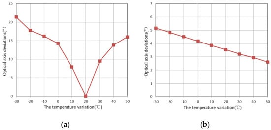 The variations in the optical-axis deviation of the main system vs. the temperature variation. The data results were obtained through the overall optical model of the telescope. (a) Before compensation; (b) after compensation.