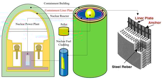 The nuclear reactor containment building is a concrete building where the core facility, the nuclear reactor, and the reactor coolant system are installed. The reactor containment building of the Korea standard nuclear power plant (KSNPP) is a structure with a hemispherical roof and is a symbol of the nuclear power plant. As shown in Figure 1, a nuclear power plant containment building includes several layers of containment structures. The reactor containment building is made of reinforced concrete walls about 1.2 m thick, and the interior is sealed with a 6 mm steel plate called a CLP [6]. The concrete structure and CLPs are multi-layered protective walls that protect the internal reactor from external attacks in case of an emergency, prevent external leakage and exposure of radioactive materials in the event of an accident inside the dome, and perform the final protective function. When CLP is constructed, various structures (concrete, rebar, etc.) and additives are included inside and outside the CLP. The back of the CLP is attached to concrete, and voids may be created in this process. Corrosion defects are created on the back of the CLP due to voids in the concrete, which develop into thinning defects [7,8,9]. Ultimately, it reduces the strength of CLPs and concrete containment buildings and can lead to serious accidents [10,11]. Currently, non-destructive testing of the CLP of nuclear power plants in operation is mainly performed by examining the thickness of the CLP using local ultrasonic testing (UT) and visual inspection (VT) to check whether the CLP is penetrated or deformed [12]. However, the containment structure is very large and there are limitations due to the disadvantages of UT inspection (small inspection area, inspection result quality depending on operator proficiency, etc.). In addition, there is a method of estimating the concrete voids that cause CLP thinning through the striking sound of the CLP surface. Most techniques only apply inspection to the sidewall shell portion of the containment building, and only perform VT on the upper dome portion due to limited accessibility. These inspection techniques are mostly localized and have limitations in identifying CLP thinning or the shape of concrete voids. Recently, phased array ultrasonic testing (PAUT), acoustic resonance method (ARM), and CLP inspection techniques using automated scanners are being studied [6,12]. However, relatively complex mechanisms and signal processing are required to determine the shape of the defect. Therefore, if it is possible to evaluate CLP thinning defects using infrared thermography, quick and useful inspection will be possible.