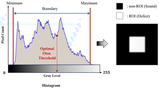 Simplifying thermography images through binarization allows for intuitive evaluation of defects and characterizes automatic detection of various defects. Figure 3 shows the binarization process of the Otsu algorithm. As shown in Figure 3, the Otsu algorithm is a technology that finds the optimal threshold value through the histogram of the input image and performs binarization. This is a method to find an optimal threshold that minimizes the variance or maximizes the difference between classes when classifying pixels in an image into two classes [15].