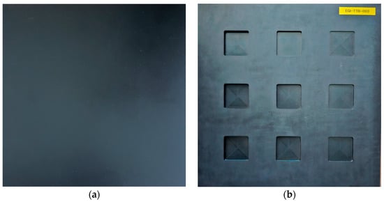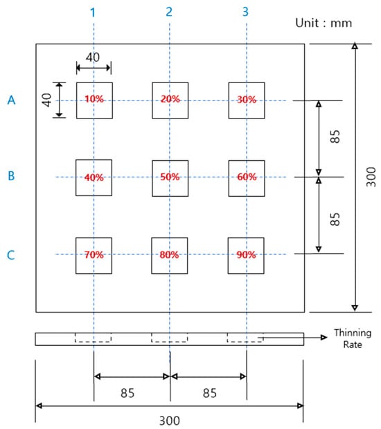 The sample applied in this study was a square plate-shaped sample made of S275 material, which is used in CLPs. Figure 4 shows the geometric information of the thinning defect sample. The thinning defect sample is 300 × 300 mm, and the thinning size in subsurface of the sample is constant at 40 × 40 mm. The thickness of the sample considered was 6 mm, which is the CLP thickness of KSNPP, as described in Section 1. As for the thinning depth, 9 defects of 10%, 20%, 30%, 40%, 50%, 60%, 70%, 80%, and 90% of the total thickness of the specimen were considered. A rows A to C and columns 1 to 3 show the respective thinning defect identification information. Table 1 shows quantitative information for each defect ID. Figure 5 shows a picture of the sample. Figure 5a shows the front of the test sample, where matte black paint was applied to the surface to maintain the emissivity above 0.9, and Figure 5b shows the thinning defect generated on the back side.