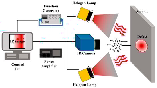 LIT is one of the most widely used TT techniques [22]. LIT is a technology that simultaneously stimulates sinusoidal heat as a heat source across the entire surface of the object to be inspected and senses the IR signal emitted from the surface with an IR camera. Using sinusoidal waveforms results in the ability to preserve the shape and frequency, while the only deviation from the reference wave will be the magnitude and phase delay [23]. Defect detection is possible by demodulating this phase change and comparing and analyzing the difference between the sound area and the defective area. LIT modulates the heat source that stimulates the object in the form of a harmonic function and synchronizes the detection element to demodulate the phase change of the harmonic function. As a result of extracting phase changes using lock-in technology, even minute temperature changes on the surface can be detected even at low sampling, reducing the impact of uneven surface emissivity. In addition, inspectors can obtain good results by controlling the influence of environmental factors such as ambient temperature, measurement angle, and wind speed [24].