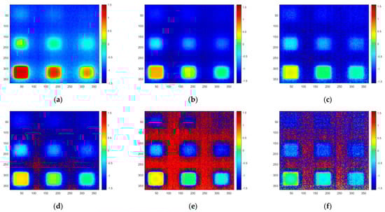 Results of phase images by the four-point method: (a) 0.01 Hz, (b) 0.02 Hz, (c) 0.03 Hz, (d) 0.04 Hz, (e) 0.05 Hz, and (f) 0.1 Hz.