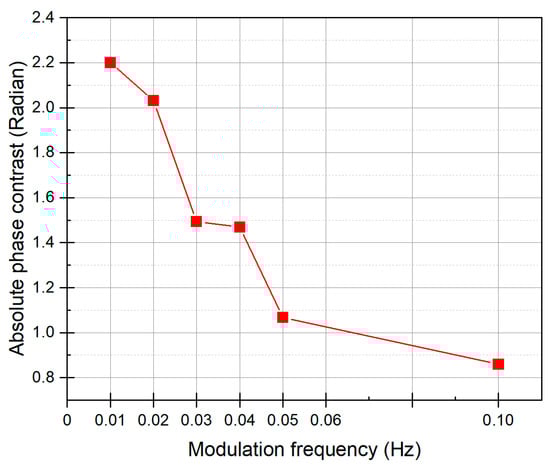 Figure 8 shows the absolute phase contrast value of the C3 (thinning rate: 90%) defect between the defective area and the sound area. For defect areas in phase contrast calculations, the average value of 10 × 10 pixels was considered at each defect center. For the sound area, the average value of 10 × 10 pixels in the area adjacent to the defect was considered. As shown in Figure 8, the phase contrast improves as the modulation frequency decreases. The maximum phase contrast is 2.2006 radian at 0.01 Hz, and the minimum phase contrast is 0.86 radian at 0.1 Hz.