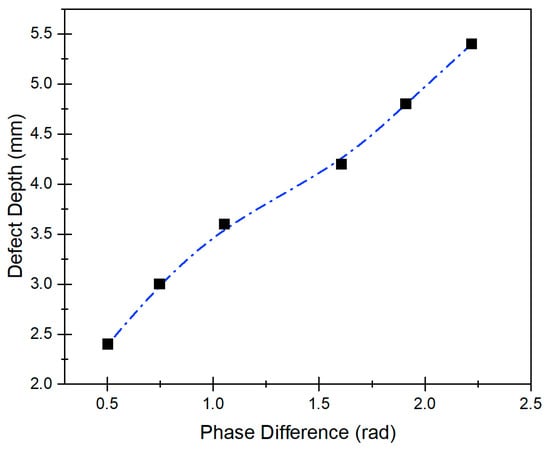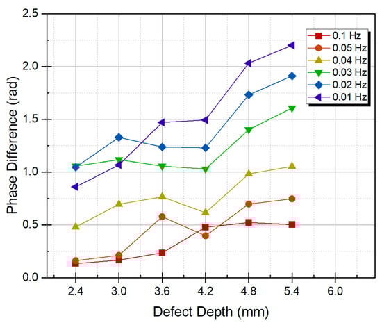Figure 9 shows the trend of phase change according to thinning defect depth and modulation frequency. As can be seen in Figure 9, for all thinning defects, the phase angle tended to increase as the depth increased. In addition, it was found that as the modulation frequency increases from 0.01 Hz to 0.1 Hz, the phase change decreases and the phase difference between the sound area and the thinning area decreases.