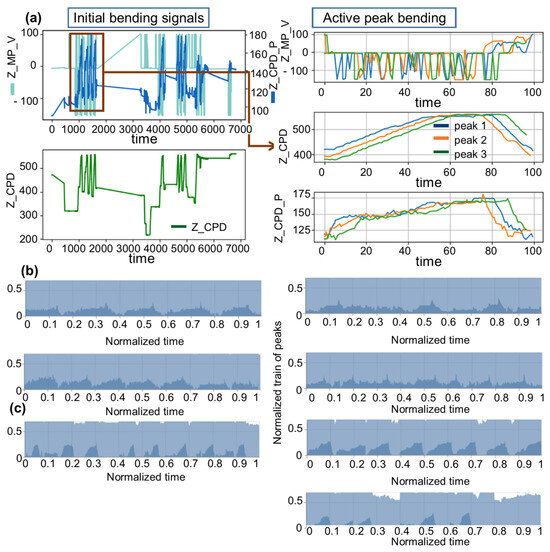 Analysis and classification of (a) segments of the signal where the bending of the collar occurs, (b) train of active bending peaks in thinner sheet, and (c) train of active bending peaks in thicker sheet.