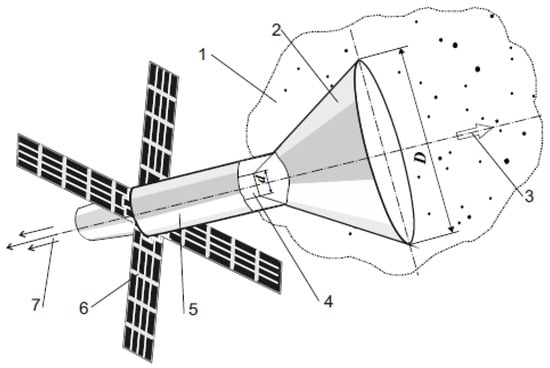Spacecraft diagram: 1—interplanetary dust; 2—particle trap; 3—the spacecraft’s movement direction; 4—discharge chamber; 5—ship; 6—solar panel; 7—plasma flow creating the ship’s thrust [9].