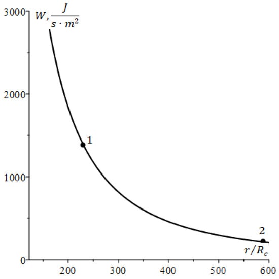 Dependence of solar radiation power as a function of distance between Sun and Ceres. Here, 1 corresponds to the Earth orbit (.) and 2—the Ceres orbit () [8,9].
