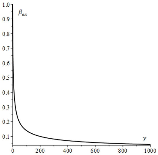 The relation (13) shows how depends on the spacecraft’s velocity and the characteristics of the interplanetary medium via the parameter . As an illustration of this, Figure 3 presents a graph of for relatively small values of . As can be seen in Figure 3, for greater values a nonrelativistic case is realized in which . Such dynamics result from the growing number of particles captured with an increase in velocity when the absorbed energy per particle falls.