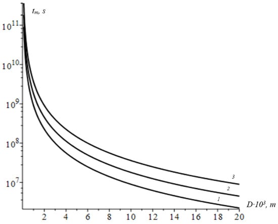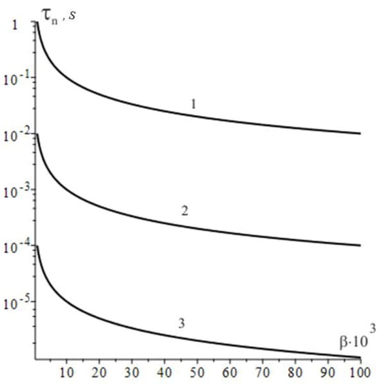 The characteristic accumulation time as a function of for different values of . Curve 1 corresponds ; curve 2 corresponds and curve 3 corresponds .