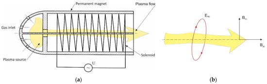 Herein, the acceleration effect depends on the ratio between and , but it does not depend on the magnitude of itself. So, there is no need to create a large current in the solenoid, and one can expect to achieve significant acceleration of the plasma flow. Unfortunately, the described method of creating the required configuration of magnetic fields does not seem optimal since the ideal field distribution presented in Figure 5b can hardly be fully realized in the scheme shown in Figure 5a.