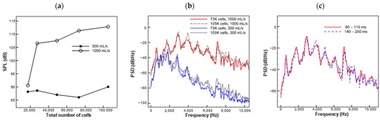To ensure that the simulation produced statistically steady results, the spectra of the 1000 mL/s case were computed using two different time durations: 60–110 ms and 140–250 ms. As shown in Figure 2c, the two spectra were found to be nearly identical, indicating that the simulation reached statistical steadiness at up to 110 ms. Therefore, most of the cases in the parametric space discussed below were simulated for 110 ms, and an interval of 60–110 ms was used for analysis. However, in cases where the flowrate was very low, resulting in a low sound frequency, the simulation was extended to 220 ms to provide sufficient data for Fourier analysis.