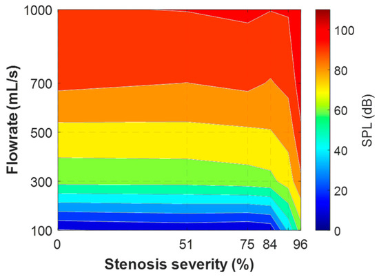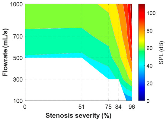 Figure 4 shows the overall sound pressure level for parametric cases with the neutral glottis (g = 1.1 cm) and a fixed SGS distance of 2.0 cm. The cases with an SPL below 0 dB are left blank, as they are below the threshold of human hearing. The results reveal that the sound is mostly inaudible when the flowrate is below 500 mL/s except for with high severity. Additionally, the impact of the SGS on the SPL is negligible when the severity is lower than 50%, and the SPL is mostly determined by the flowrate, reaching a maximum of approximately 60 dB at a flowrate of 1000 mL/s. As the severity increases beyond 50% to 75%, the SPL begins to increase, and as the severity surpasses 75%, the SPL sees a rapid increase and becomes more influenced by the severity of the SGS. At 96% obstruction, the sound is audible at almost all flowrates, and reaches almost 110 dB at 1000 mL/s.