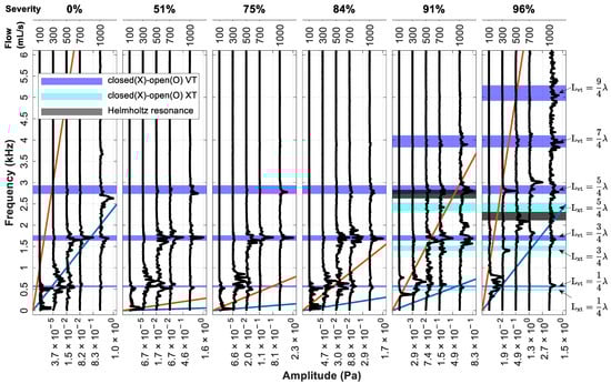 Figure 5 depicts the spectra for the neutral glottis with a fixed SGS distance of 2.0 cm. The spectra are divided into subfigures, each containing five cases that share the same SGS severity but have increasing flowrates (shown at the top). Each black curve in the subfigures represents the spectrum of the acoustic pressure of a single case. The amplitude of the spectra is normalized with respect to the highest peak of each case. The spectrum is shown up to 4000 Hz, beyond which the amplitude is almost zero. To aid in the interpretation of the spectra, shaded bands are included to represent estimated frequencies of various sources of acoustic resonance, including the harmonics of the vocal tract (VT) from the glottis to the mouth and the harmonics of the extended tract (XT) from the SGS to the mouth (see Figure 1c). Note that, depending on the size of the SGS and the glottis, the vocal tract and extended tract can be considered as having an open–open (O-O) or a closed–open (X-O) end condition. The frequencies of the harmonics are estimated using the formulas for straight tubes with ideal O-O or X-O end conditions, and the specific acoustic modes are annotated to the right. The bands are thickened to suggest a larger error in the estimated frequencies for higher harmonics [55]. A detailed explanation of the frequency estimates is provided in Appendix A. The characterization of the tonal sound is based on the matching between the spectrum and these frequency source estimates. Two oblique lines in the subfigures indicate a constant Strouhal number (St) of 0.1 (blue line) and 0.5 (orange line), which are calculated based on the size of the smaller orifice in the system and its average jet velocity.