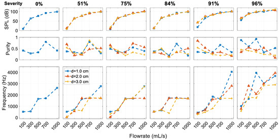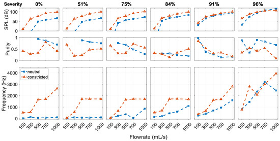 It can be seen from the spectra that constricting the glottis has a significant influence on the sound. To facilitate comparison, Figure 8 presents the SPL, purity, and the dominant frequency (corresponding to the highest peak in the spectra) for the corresponding cases with different glottal configurations. With the constricted glottis, the pitch and SPL are generally higher except for in the most severe SGS cases. At a low SGS severity (<50%), the weak glottal jet tones in the neutral glottis cases are replaced by strong tract harmonics. At a medium SGS severity (75%), the SGS hole tones are also replaced by the tract harmonics. At the highest severity (96%), the excited tones in both configurations are tract harmonics-dominant, but the effective length of the resonant tract is slightly different. The effective tract length for the neutral glottis configuration is slightly longer with the SGS functioning as the closed end. However, the change of the dominant frequency is difficult to predict as it depends on the acoustic mode and changes nonlinearly with the flowrate. The purity of the tones is lower at this severity.