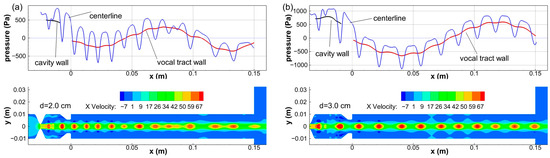 At the highest severity of SGS, tones of lower pitches are generally excited as the stenosis moves away from the glottis with a few exceptions. This is due to two contributing factors: (1) the length of the extended vocal tract increases, leading to decreases in the frequencies of tract harmonics, (2) the longer travel distance of the stenosis jet tends to reduce the hole tone frequency, which is particularly evident in the 700 mL/s cases. As the stenosis distance increases from 1.0 cm to 2.0 cm to 3.0 cm, the sound frequency decreases from about 5400 Hz to about 3300 Hz and then to about 2300 Hz. The pure excitation in these cases allows for a clear view of a standing wave in the vocal tract. Figure 10 illustrates the acoustic mode of the d = 2.0 cm case and the d = 3.0 cm case. Since the pressure drop along the tract is low, the acoustic pressure can be approximated by the gauge pressure near the wall. The centerline pressure is the superposition of the acoustic pressure and the flow pressure. Compared to the quarter wave plus a 3/2 wave mode observed in the d = 2.0 cm case, the d = 3.0 cm case has a single wave in the vocal tract, which is the next lower acoustic mode. In both cases, the glottal exit is a pressure node.