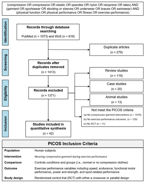 The current systematic review and meta-analysis were performed consistent with suggestions by the Preferred Reporting Items for the Systematic Reviews and Meta-Analysis (PRISMA) statement. We reported all checklist items (Supplementary Table S1) and the PRISMA flow diagram [26]. Given that we already completed data extraction and analyses, the protocol registration for this study failed. According to the PRISMA statement [27], we established the inclusion criteria following the PICOS format [28]: (1) Population: healthy adults including athletes, high, moderately, or lightly trained adults, and no trained adults: (2) Intervention: compression garments; (3) Comparison: control group without wearing compression garments; (4) Outcome: exercise performances (i.e., endurance, speed, power and strength, functional motor performances, and sport-related performances); (5) Study design: randomized control trials (RCT) including either crossover or parallel design. Further, literature review studies, case studies, and studies without sufficient information for effect size calculation were removed. Two authors (HL and RK) completed an independent literature identification process using two search engines (i.e., PubMed and Web of Science) from 12 September to 30 October 2023. We used the following keywords: (compression OR compressive OR elastic OR spandex OR nylon OR neoprene OR latex) AND (garment OR sportswear OR stocking OR sleeves OR underwear OR braces OR swimwear) AND (physical function OR physical performance OR fitness OR exercise performance).